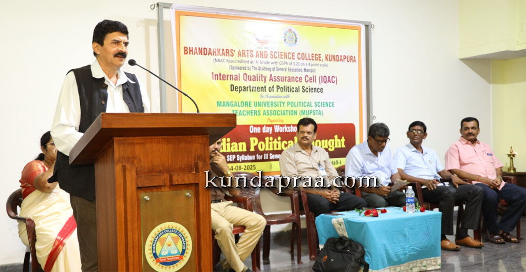 ಅವರು ಇಲ್ಲಿನ ಭಂಡಾರ್ಕಾರ್ಸ್ ಪದವಿ ಕಾಲೇಜಿನಲ್ಲಿ ರಾಜ್ಯಶಾಸ್ತ್ರ ವಿಭಾಗ, ಆಂತರಿಕ ಗುಣಮಟ್ಟ ಭರವಸೆ ಕೋಶ, ಮತ್ತು ಮಂಗಳೂರು ವಿಶ್ವವಿದ್ಯಾಲಯದ ರಾಜ್ಯ ಶಾಸ್ತ್ರ ಉಪನ್ಯಾಸಕರ ಸಂಘದ ಸಹಯೋಗದಲ್ಲಿ ಗುರುವಾರ ನಡೆದ ತೃತೀಯ ಸೆಮಿಸ್ಟರ್ ರಾಜ್ಯ ಶಾಸ್ತ್ರ ಪಠ್ಯಕ್ರಮದ ಕುರಿತು ಕಾರ್ಯಾಗಾರವನ್ನು ಉದ್ಘಾಟಿಸಿ ಮಾತನಾಡಿದರು.