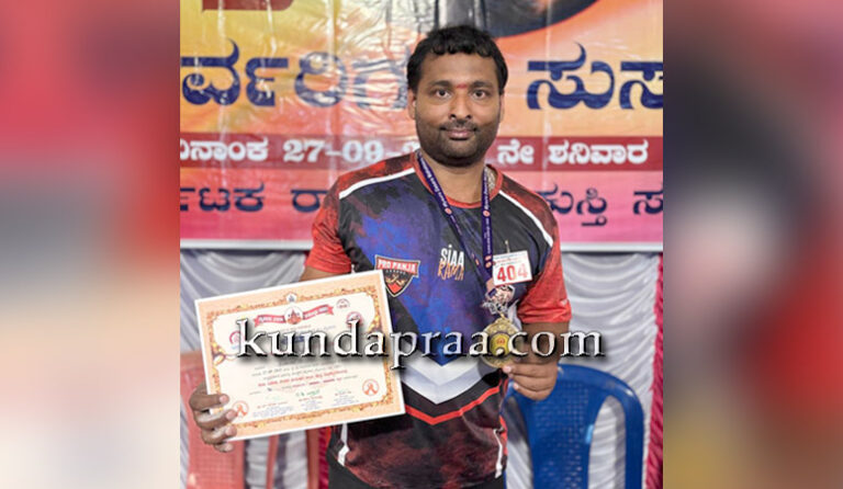 ಕೋಟ: ಮೈಸೂರಿನ ದಸರಾ ಕಾರ್ಯಕ್ರಮದ ಪ್ರಯುಕ್ತ ನಡೆದ ರಾಜ್ಯ ಮಟ್ಟದ ಪಂಜಾ ಕುಸ್ತಿ ಸ್ಪರ್ಧೆಯಲ್ಲಿ ಉಡುಪಿ ಜಿಲ್ಲೆಯ ಬ್ರಹ್ಮಾವರ ತಾಲೂಕಿನ ಪಾಂಡೇಶ್ವರ ಗ್ರಾಮದ ಸುರೇಶ್ ಬಿ. ಪೂಜಾರಿ ಭಾಗವಹಿಸಿ 90.ಕೆಜಿ ಬಲ ಕೈ ವಿಭಾಗದಲ್ಲಿ ಚಿನ್ನದ ಪದಕ ಗಳಿಸುವುದರ ಮೂಲಕ ಸತತ 4 ವರ್ಷ ಚಿನ್ನದ ಪದಕ ಮೂಡಿಗೆರಿಸಿಕೊಂಡಿದ್ದಾರೆ.