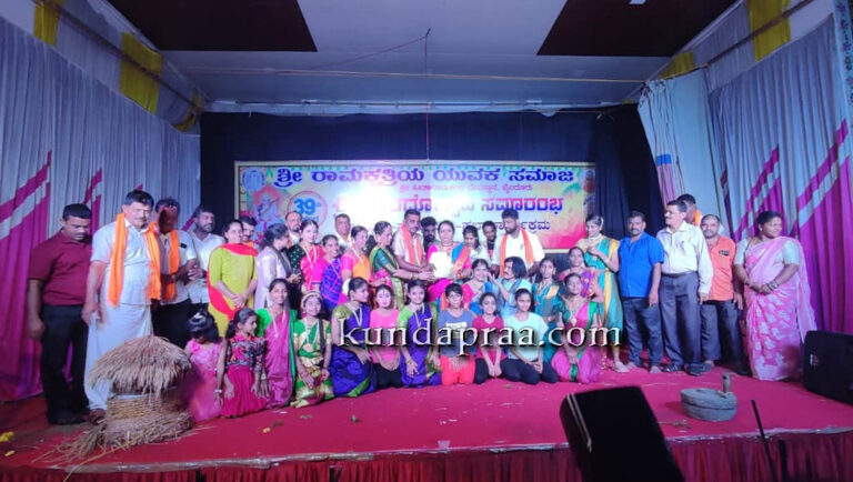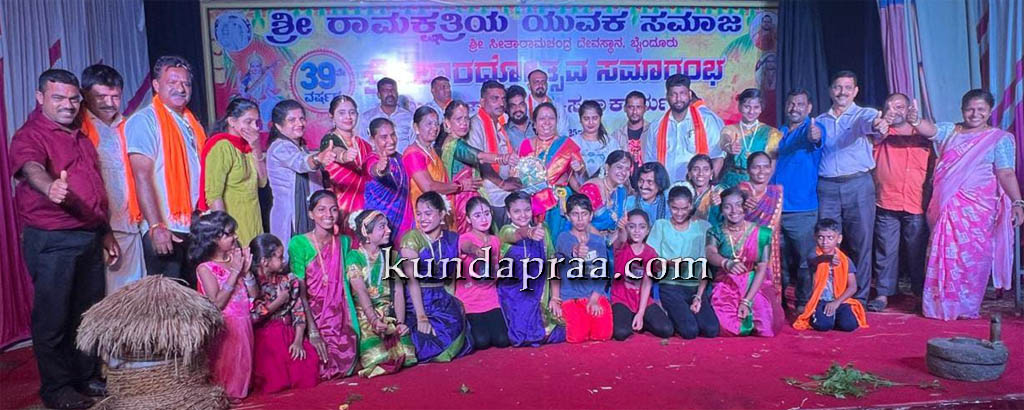 ಬೈಂದೂರು: ಬೈಂದೂರು ರಾಮಕ್ಷತ್ರಿಯ ಯುವಕ ಸಮಾಜ ಶ್ರೀ ಸೀತಾರಾಮಚಂದ್ರ ದೇವಸ್ಥಾನದ 39ನೇ ವರ್ಷದ ಶಾರದೋತ್ಸವದ ಪ್ರಯುಕ್ತ ನಡೆದ ಸಾಂಸ್ಕೃತಿಕ ವೈಭವ ಸ್ಪರ್ಧೆಯಲ್ಲಿ ಪಡುವರಿಯ ಸೋಮೇಶ್ವರ ತಂಡವು ನಟಿಸಿದ ಕ್ಷಾತ್ರತೇಜ ನಾಟಕ ಪ್ರಥಮ ಸ್ಥಾನ ಗಳಿಸಿತು.