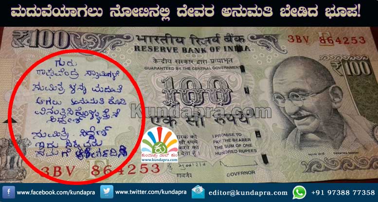 ಪ್ರೀತಿಯ ಅಮಲ ಏರಿದರೇ ಅವರ ನಡೆ-ನುಡಿಗಳ ಅಂಕೆಯಲ್ಲಿರುವುದಿಲ್ಲ ಎಂಬುದನ್ನು ಸಾಕಷ್ಟು ಪ್ರಕರಣಗಳು ಸಾಕ್ಷೀಕರಿಸಿವೆ. ಎದೆಯ ಮೇಲೆ ಟ್ಯಾಟೋ ಹಾಕಿಸಿಕೊಳ್ಳುವುದು, ಕೈಯಲ್ಲಿ ಬ್ಲೇಡಿನಿಂದ ಬರೆದುಕೊಳ್ಳುವುದು, ರಕ್ತದಲ್ಲಿ ಪ್ರೇಮಪತ್ರ ಬರೆದು ಪ್ರೇಮ ಪರಾಕಾಷ್ಟೆ ತೋರಿಸುವುದು ಇದ್ದೇ ಇರುತ್ತೆ. ಆದರೆ ಇಲ್ಲೊಬ್ಬ ನೂರು ರೂಪಾಯಿ ನೋಟಿನ ಮೇಲೆ ತನ್ನ ಪ್ರಿಯತಮೆಯನ್ನು ಮದುವೆಯಾಗಲು ಅನುಮತಿ ಕೋಡಿ ಎಂದು ಬರೆದುಕೊಂಡು ಗುರು ರಾಘವೇಂದ್ರ ಸ್ವಾಮಿಯ ಆಶೀರ್ವಾದ ಬೇಡಿದ್ದಾನೆ. ಅಷ್ಟೇ ಅಲ್ಲದೇ ಈ ನೋಟು ಸಿಕ್ಕಿದವರು ನಮಗೆ ಆಶೀರ್ವದಿಸಿ ಎಂದು ಬರೆದುಕೊಂಡಿದ್ದಾನೆ. ದೇವರು ಆಶಿರ್ವಾದ ಮಾಡಿದರೋ ಇಲ್ಲವೋ ಗೊತ್ತಿಲ್ಲ. ಅಷ್ಟಕ್ಕೂ ಅದು ಕಾಣಿಕೆ ಹುಂಡಿಗೆ ಹೋಗಿ ಬಂದ ನೋಟೋ ಅಥವಾ ತಮಾಷೆಗಾಗಿ ಯಾರೋ ಬರೆದದ್ದೋ ಗೊತ್ತಿಲ್ಲ ಆದರೆ ಪಿಗ್ಮಿ ಸಂಗ್ರಾಹಕರೊಬ್ಬರು ಈ ನೋಟನ್ನು ‘ಕುಂದಾಪ್ರ ಡಾಟ್ ಕಾಂ’ಗೆ ನೀಡಿದ್ದಾರೆ. ಅದೇನೇ ಇದ್ದರೂ ಸಹ ಭಾರತೀಯ ರಿಸರ್ವ ಬ್ಯಾಂಕಿನ ಚಲಾವಣೆಯಲ್ಲಿರುವ ನೋಟಿನ ಮೇಲೆ ಈ ರೀತಿ ಬರೆಯುವುದು ತಪ್ಪು ಎಂದು ತಿಳಿದಿದ್ದರೂ ಪ್ರೀತಿಯ ಅಮಲು ಹಾಗೆ ಮಾಡಿಸಿರಬೇಕು ಎಂದು ನೋಟು ಸಿಕ್ಕವರು ಹೇಳಿಕೊಂಡಿರಬಹುದು