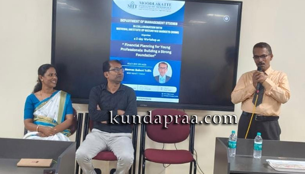 ಕುಂದಾಪುರ: ಇಲ್ಲಿನ ಮೂಡ್ಲಕಟ್ಟೆ ತಾಂತ್ರಿಕ ವಿದ್ಯಾಲಯದಲ್ಲಿ ಎಂ.ಬಿ.ಎ. ವಿಭಾಗ ವತಿಯಿಂದ ಹಾಗೂ ನ್ಯಾಷನಲ್ ಇನ್ಸ್ಟಿಟ್ಯೂಟ್ ಆಫ್ ಸೆಕ್ಯೂರಿಟೀಸ್ ಮಾರ್ಕೆಟ್ಸ್ ಸಹಯೋಗದೊಂದಿಗೆ ಫೈನಾನ್ಸಿಯಲ್ ಪ್ಲಾನಿಂಗ್ ಫಾರ್ ಯಂಗ್ ಪ್ರೊಫೆಷನಲ್ ಬಿಲ್ಡಿಂಗ್ ಎ ಸ್ಟ್ರಾಂಗ್ ಫೌಂಡೇಶನ್ ಎಂಬ ವಿಷಯದ ಬಗ್ಗೆ ಎರಡು ದಿನದ ಕಾರ್ಯಾಗಾರವನ್ನು ಹಮ್ಮಿಕೊಳ್ಳಲಾಯಿತು.