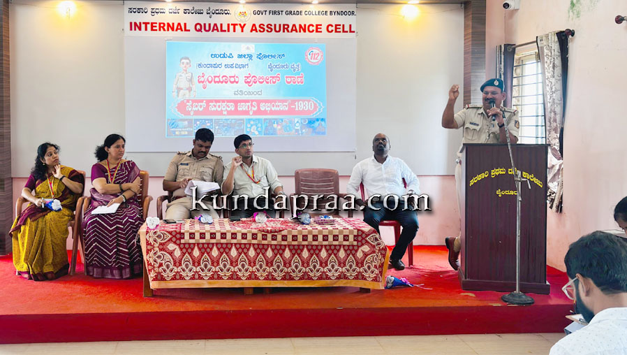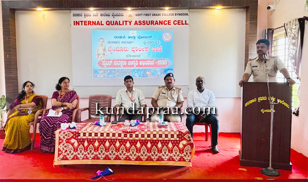 ಬೈಂದೂರು: ಬೈಂದೂರು ಪೊಲೀಸ್ ಠಾಣೆಯ ವತಿಯಿಂದ ರಾಷ್ಟ್ರೀಯ ಸೈಬರ್ ಅಪರಾಧ ಜಾಗೃತಿ ಅಭಿಯಾನ – 2025 ಮತ್ತು ರಾಷ್ಟ್ರೀಯ ಏಕತಾ ದಿವಸದ ಪ್ರತಿಜ್ಞಾವಿಧಿ ಕಾರ್ಯಕ್ರಮವನ್ನು ಇಲ್ಲಿನ ಸರಕಾರಿ ಪ್ರಥಮ ದರ್ಜೆ ಕಾಲೇಜಿನಲ್ಲಿ ಗುರುವಾರದಂದು ಆಯೋಜಿಸಲಾಯಿತು.