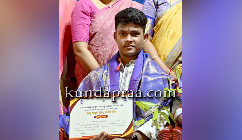 ಕುಂದಾಪುರ: ಮಹಿಳಾ ಮತ್ತು ಮಕ್ಕಳ ಅಭಿವೃದ್ಧಿ ಇಲಾಖೆ ಉಡುಪಿ ಜಿಲ್ಲೆ ವತಿಯಿಂದ ಕೊಡಲ್ಪಡುವ 2025-26ನೇ ಸಾಲಿನ ಸಂಗೀತ ಕ್ಷೇತ್ರದಲ್ಲಿನ ಅಸಾಧಾರಣ ಸಾಧನೆಗಾಗಿ ಜಿಲ್ಲಾ ಮಟ್ಟದ ಹೊಯ್ಸಳ ಮತ್ತು ಕೆಳದಿ ಚೆನ್ನಮ್ಮ ಪ್ರಶಸ್ತಿಯನ್ನು ಗಂಗೊಳ್ಳಿ ಎಸ್. ವಿ. ಆಂಗ್ಲ ಮಾಧ್ಯಮ ಶಾಲೆಯ 10ನೇ ತರಗತಿ ವಿದ್ಯಾರ್ಥಿ ಶಾಮ್ ಜಿ. ಎನ್. ಪೂಜಾರಿಗೆ ನೀಡಿ ಗೌರವಿಸಲಾಯಿತು.