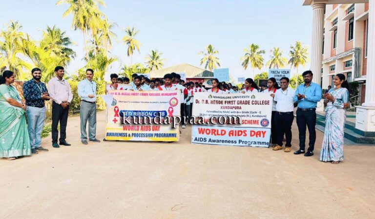 ಕುಂದಾಪುರ: ಇಲ್ಲಿನ ಡಾ. ಬಿ.ಬಿ. ಹೆಗ್ಡೆ ಪ್ರಥಮ ದರ್ಜೆ ಕಾಲೇಜಿನ ಯುವ ರೆಡ್ಕ್ರಾಸ್ ಹಾಗೂ ರಾಷ್ಟೀಯ ಸೇವಾ ಯೋಜನಾ ಘಟಕದ ಜಂಟಿ ಆಶ್ರಯದಲ್ಲಿ ವಿಶ್ವ ಏಡ್ಸ್ ದಿನದ ಪ್ರಯುಕ್ತ ವಿದ್ಯಾರ್ಥಿಗಳಿಗೆ ಹಾಗೂ ಸಾರ್ವಜನಿಕರಿಗೆ ಅರಿವು ಮೂಡಿಸುವ ನಿಟ್ಟಿನಲ್ಲಿ ಕಾಲೇಜಿನಿಂದ ಸಂಗಮ್ ಜಂಕ್ಷನ್ವರೆಗೆ ಜಾಥಾ ನಡೆಯಿತು.