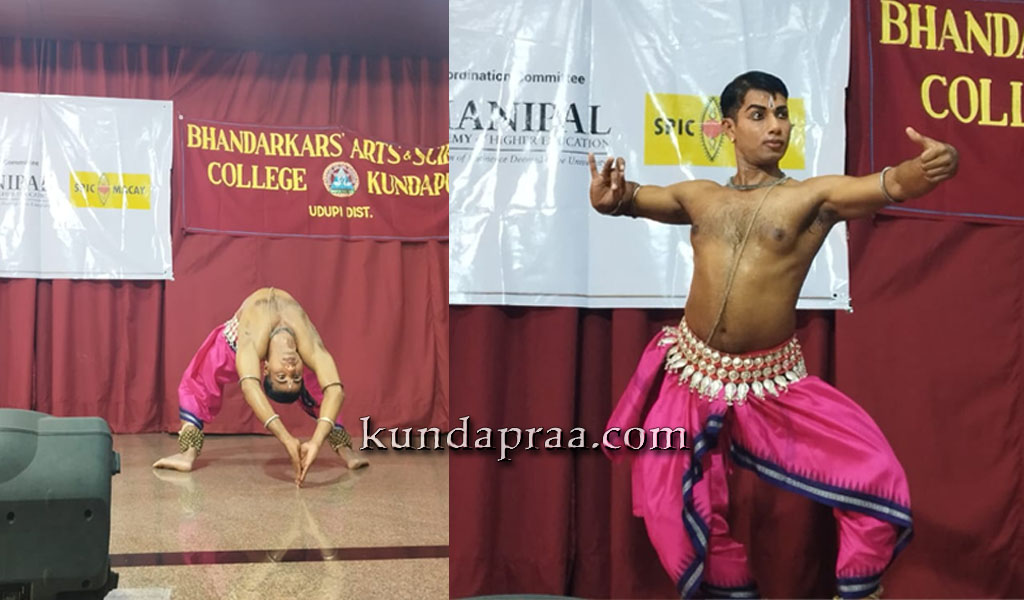 ಕುಂದಾಪುರ: ಇಲ್ಲಿನ ಭಂಡಾರ್ಕಾರ್ಸ್ ಕಾಲೇಜಿನಲ್ಲಿ ಮಾಹೆ ಸಂಸ್ಕೃತಿ ಸಮನ್ವಯ ಸಮಿತಿ ಮತ್ತು ಸ್ಪಿಕ್ ಮೆಕೆ ಸಹಯೋಗದೊಂದಿಗೆ ಬಿಸ್ಮಿಲ್ಲಾ ಪ್ರಶಸ್ತಿ ಪಡೆದ ಪ್ರಸಿದ್ಧ ಒಡಿಸ್ಸಿ ನೃತ್ಯಗಾರ ರಾಹುಲ್ ಆಚಾರ್ಯ ಅವರು ಒಡಿಸ್ಸಿ ನೃತ್ಯವನ್ನು ಬುಧವಾರ ಪ್ರದರ್ಶಿಸಿದರು.