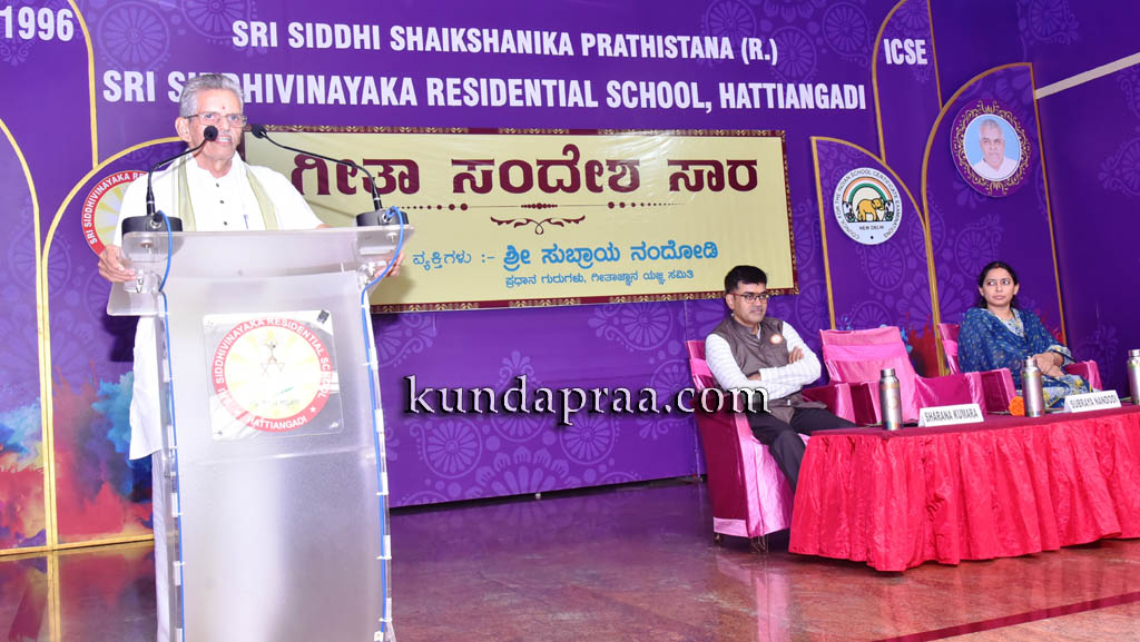 ನಂತರ ಗೀತಾ ಜ್ಞಾನ ಯಜ್ಞದ ಪ್ರಧಾನ ಗುರುಗಳಾದ ಸುಬ್ರಾಯ ನಂದೋಡಿ ಅವರು ಮಾತನಾಡಿ, ಜೀವನವನ್ನು ಬೆಳಗಿಸುವ ಗ್ರಂಥ ಭಗವದ್ಗೀತೆ. ಚಂಚಲವಾದ ಮನಸ್ಸನ್ನು ಹತೋಟಿಯಲ್ಲಿಟ್ಟುಕೊಂಡು ಪ್ರತಿಯೊಬ್ಬ ವ್ಯಕ್ತಿಯೂ ದೇಶದ ಶಕ್ತಿಯಾಗಬೇಕು. ಸ್ವಾತಂತ್ರ್ಯ ಪಡೆದ ಶತಮಾನೋತ್ಸವದಲ್ಲಿ ಭಾರತ ದೇಶದ ಪ್ರತಿಯೊಬ್ಬ ನಾಗರಿಕನೂ ಭಗವದ್ಗೀತೆಯ ಜ್ಞಾನವನ್ನು ಹೊಂದಿದವನಾಗಬೇಕು. ಮನೆ ಮನೆಗಳಲ್ಲೂ ನಿತ್ಯ ಭಗವದ್ಗೀತೆಯ ಅಧ್ಯಯನ ಆಗಬೇಕು ಎಂದರು.